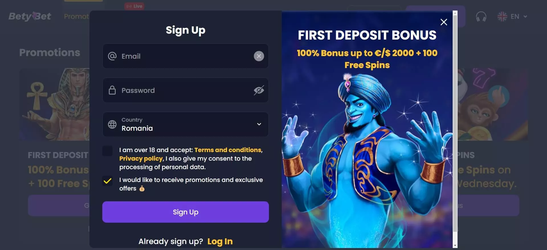 Apeși din nou Sign Up și te înregistrezi la BetyBet online casino.
