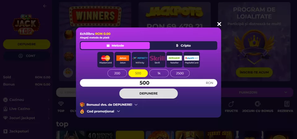 Poți efectua plăți în Ron pe site oficial Jacktop online casino în România 2024 folosind următoarele instrumente de plată: