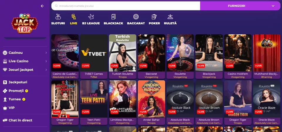 Portofoliule de jocuri trece de 5000, iar numărul de producători este de 63. Tipuri de jocuri disponibile sunt crash, live casino, pacanele, jocuri de masă, etc. Sunt disponibile turnee de jocuri Jacktop casino online de la furnizori premium. Poți juca aceste jocuri în versiune mobilă online casino Jacktop securizată și optimizată pentru toate browserele.