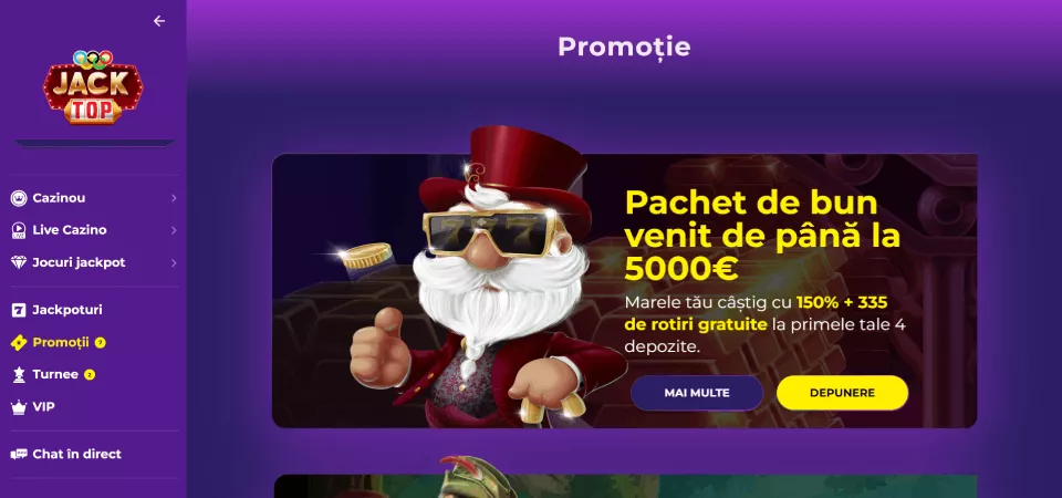 La înregistrare la Jacktop online casino primești un pachet de până la €5000 (350% pentru 4 depuneri) + 335 RG (depozit minim €20, rulaj 50x). După creare contjucător primești și alte bonusuri: